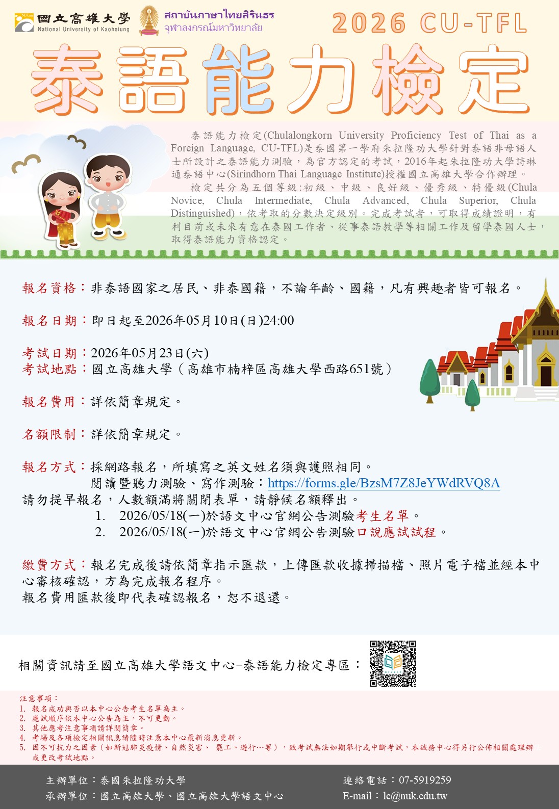 | 公告主旨 | 國立高雄大學與泰國朱拉隆功大學合作辦理泰語能力檢定 |