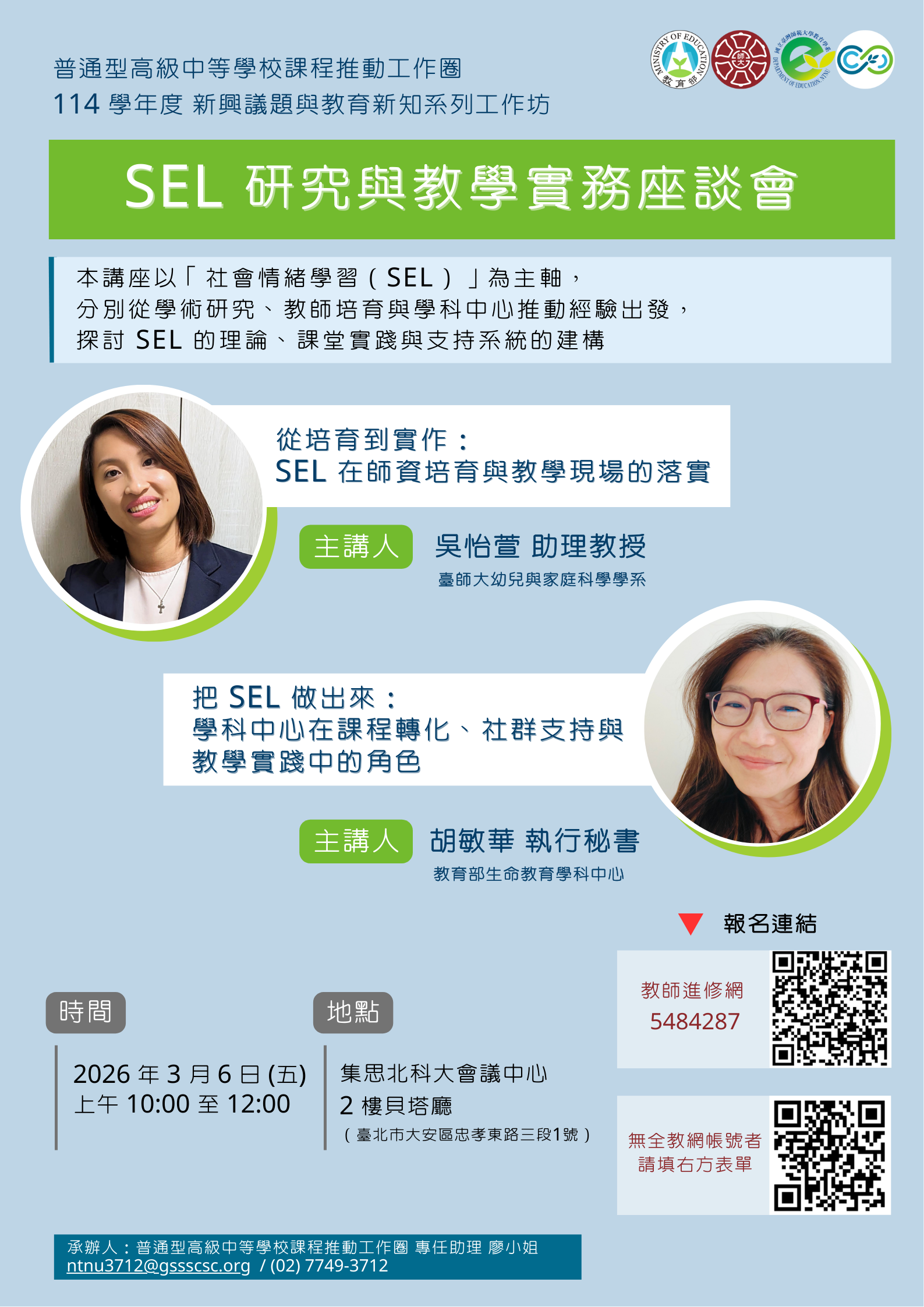 | 公告主旨 | 普通型高級中等學校課程推動工作圈114學年度新興議題與教育新知系列工作坊_SEL 研究與教學實務座談會 |