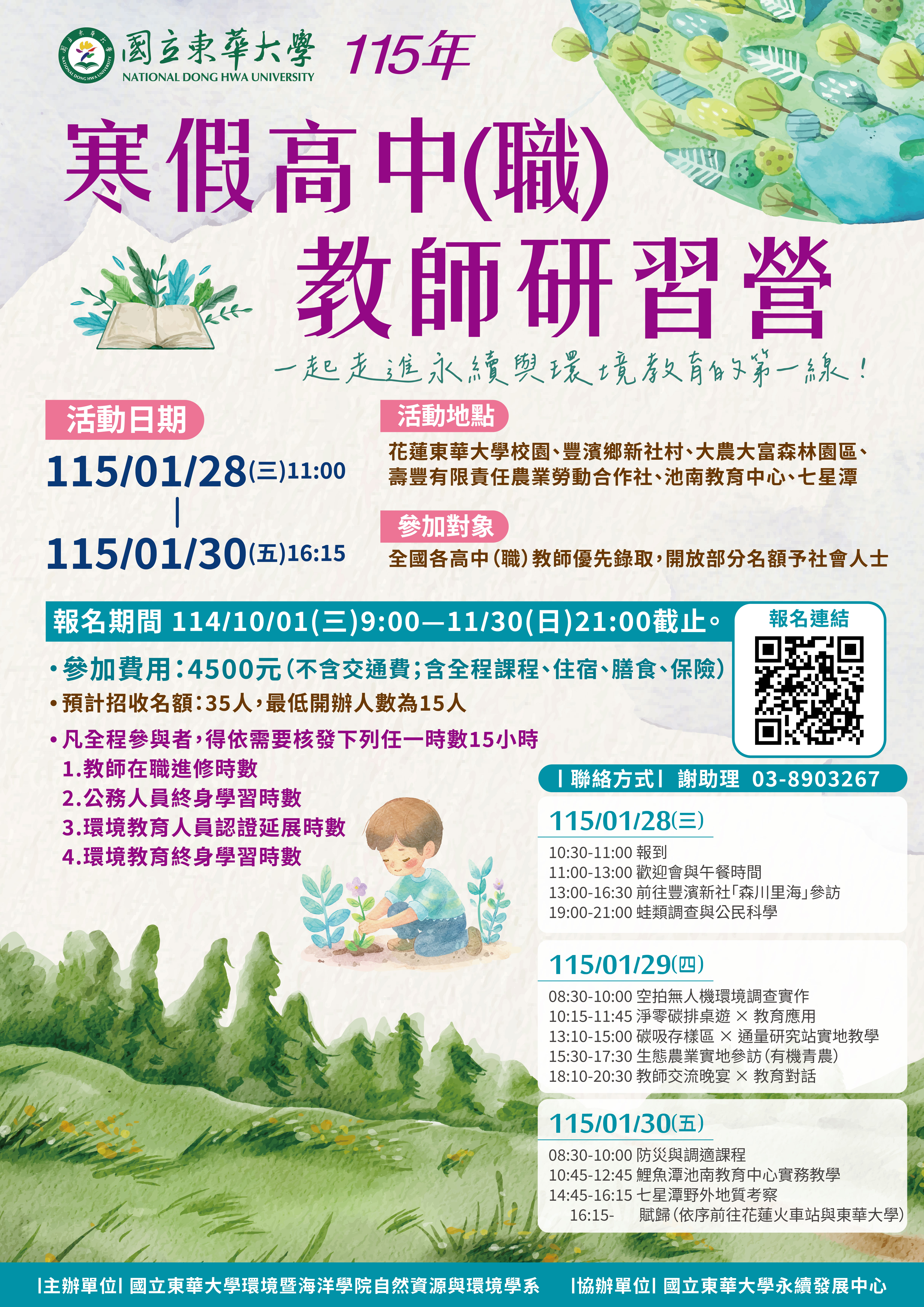 訊息公告 公告主旨 延長報名至11/30~東華大學自然資源與環境學系舉辦【115年寒假高中職教師研習營活動】 發佈日期 2025 年 10 月 31 日 發佈單位 實研組 公告類別 教師研習資訊 公告等級 無 點閱次數 94 公告內容 相關附件 教師研習簡章 教師研習簡章 檔案名稱檔案大小檔案格式下載教師研習簡章.pdf3.88 MB新視窗開啟檔案 教師研習簡章.pdf 【2025-10-31】轉知「2026年臺灣國際科學展覽會」相關消息。 【2025-10-31】義守大學「2025 SDGs視覺設計學生創意競賽」