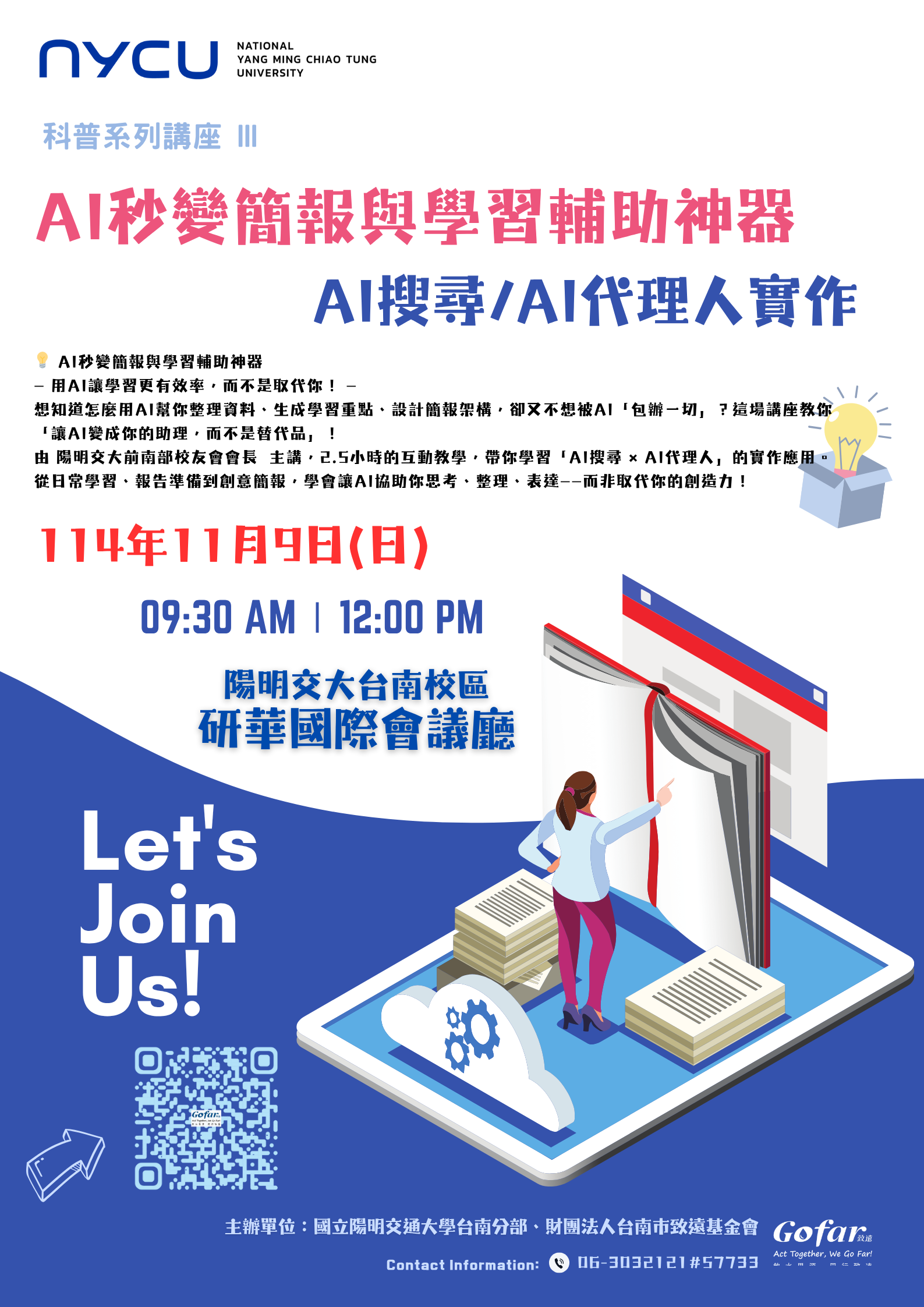 | 公告主旨 | 轉知「科普講座系列_AI秒變簡報與學習輔助神器_AI搜尋/AI代理人實作」活動資訊 |