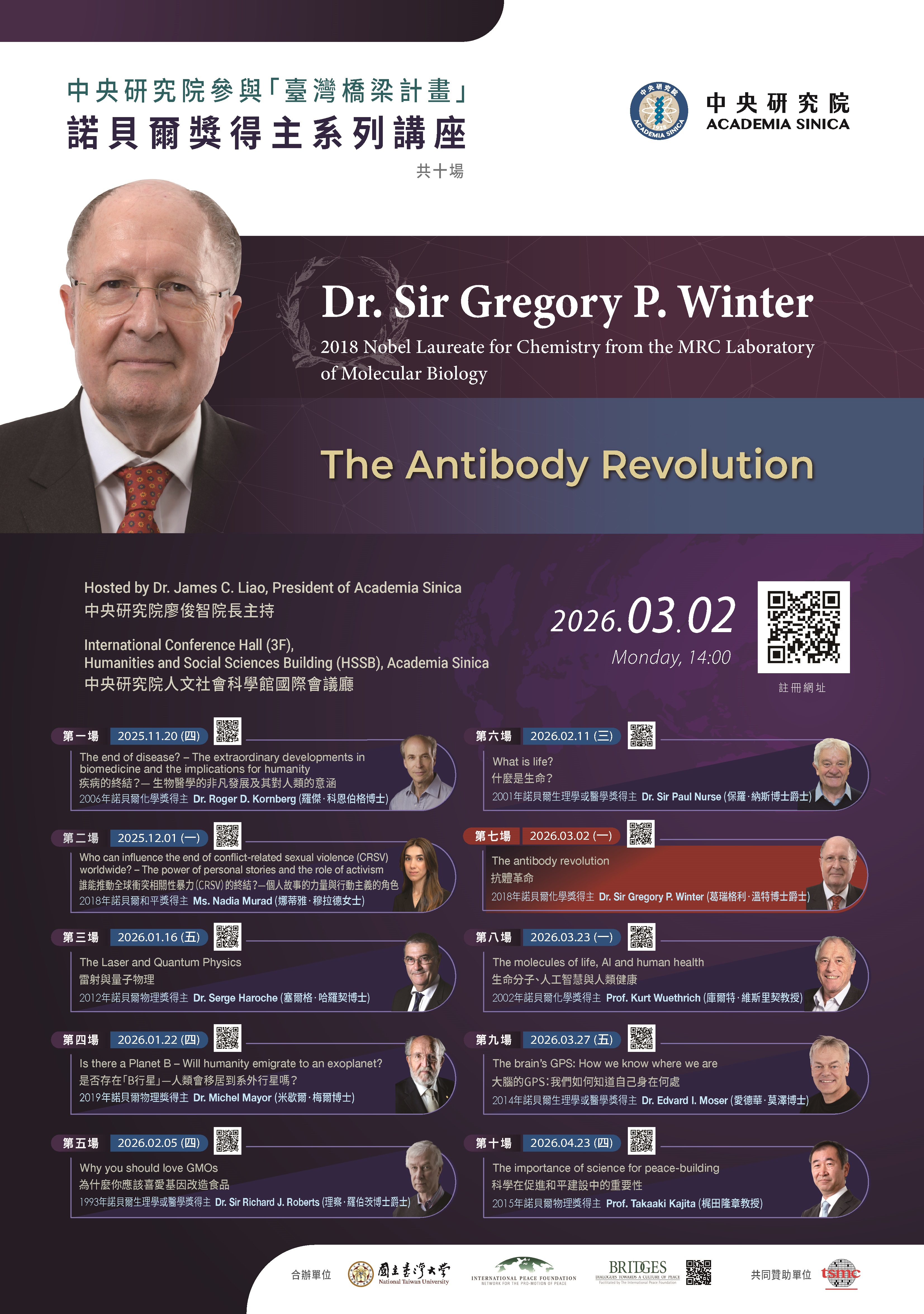 訊息公告 公告主旨 轉知中研院「臺灣橋梁計畫」第七場演講資訊。 發佈日期 2026 年 2 月 11 日 發佈單位 設備組 公告類別 處室最新消息 公告等級 轉知 點閱次數 47 公告內容 資訊如下: (一)時間:115年3月2日(星期一)下午2時整 (二)地點:本院人文社會科學館國際會議廳。 (三)講題:The Antibody Revolution(抗體革命) (四)報名方式:線上報名。 詳細資訊請參閱附件海報或至報名網頁查詢。 師生若有興趣請自行請事假前往聽講。 相關附件 海報 (51) 海報 (51) 檔案名稱檔案大小檔案格式下載海報 (51).jpg2.87 MB新視窗開啟檔案 海報 (51).jpg 【2026-02-11】轉知北市教育局115年度「女性科學日『科研.女力.新視界| 女力 ... 【2026-02-11】亞洲大學「2026生成式AI創意設計競賽」