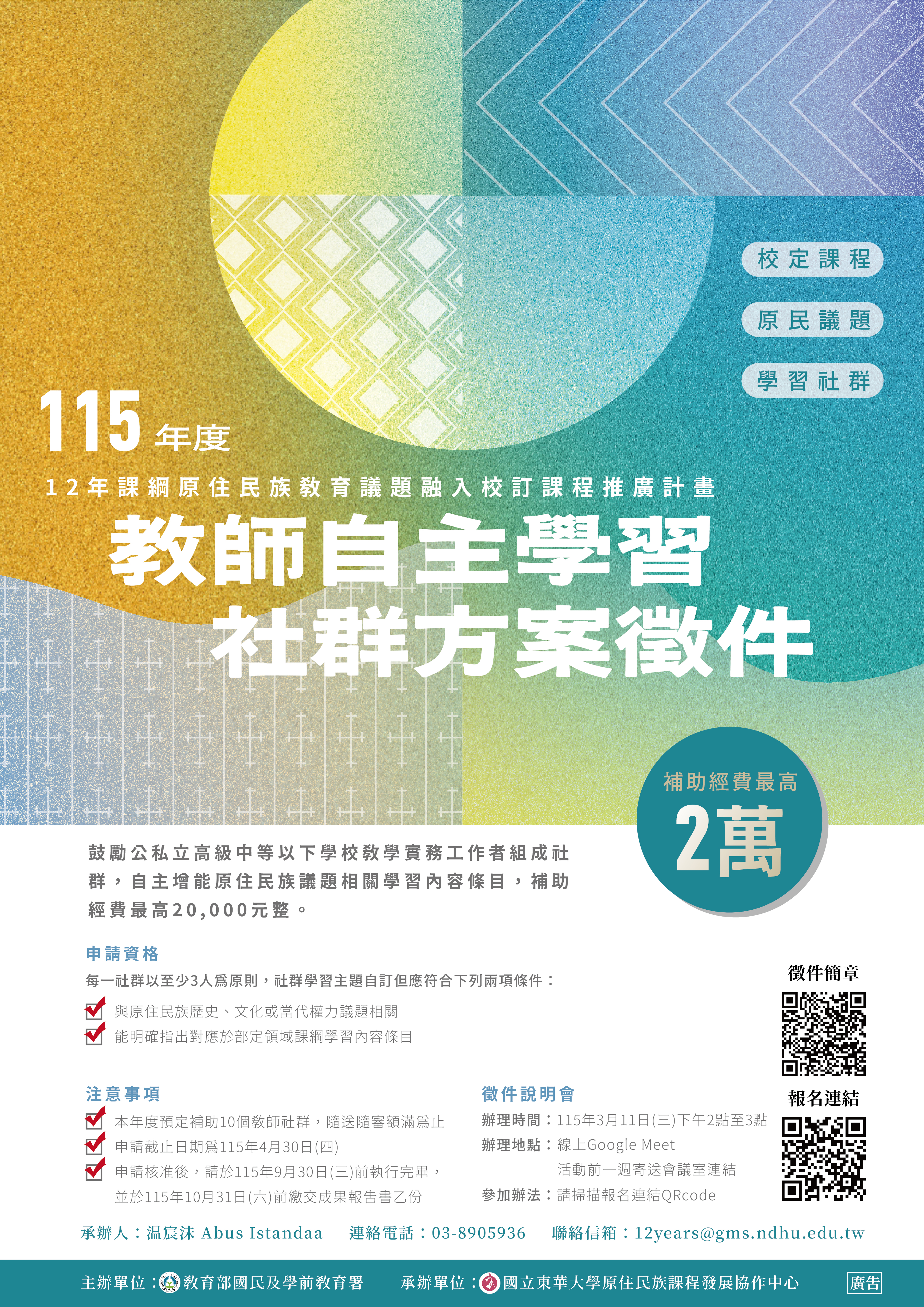 | 公告主旨 | 「115年度十二課綱原住民族教育議題融入校訂課程推廣計畫」教師自主學習社群方案徵件 |