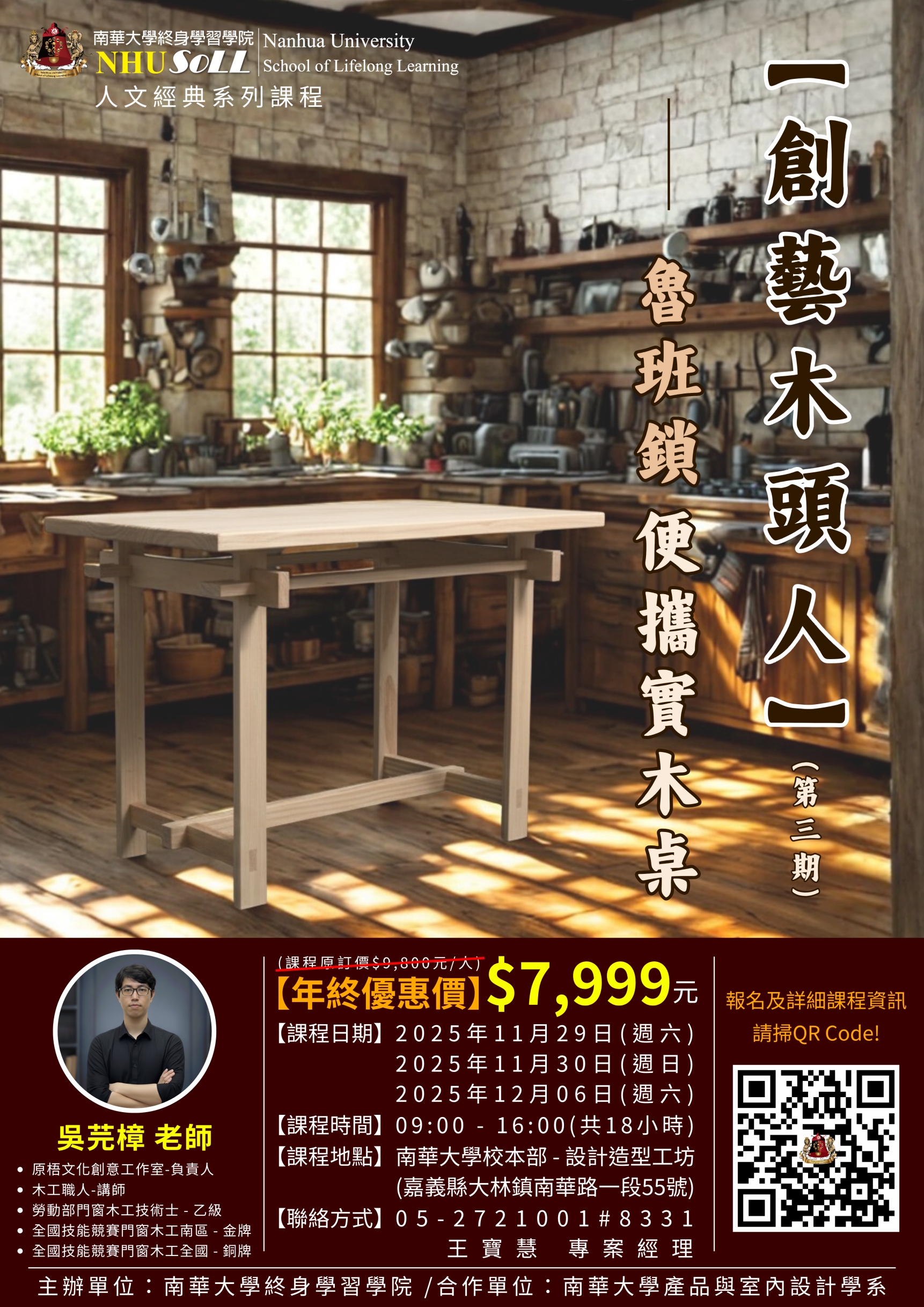 | 公告主旨 | 南華大學開辦之【創藝木頭人】(第三 期):魯班鎖便擕實木桌 |