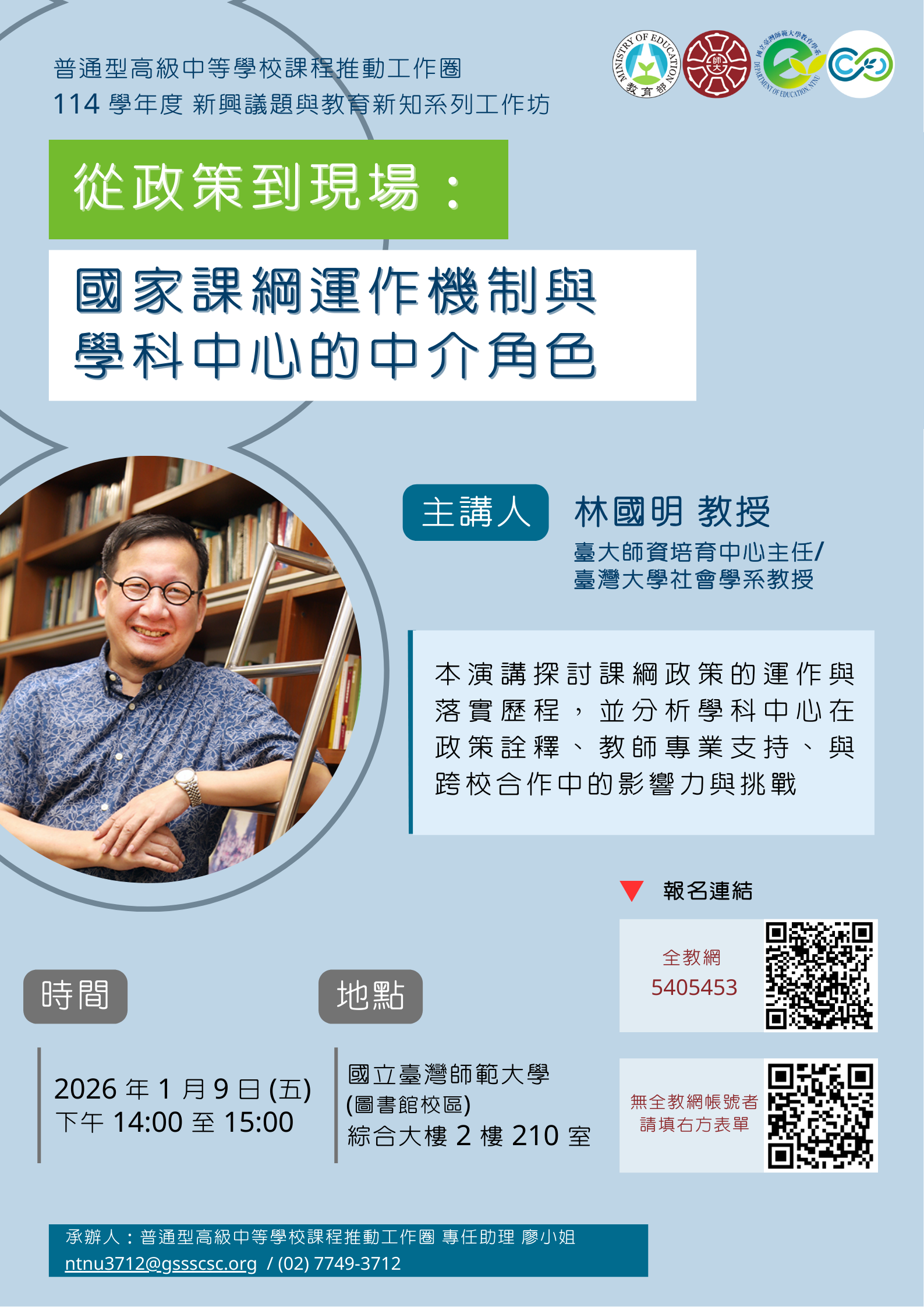 訊息公告 公告主旨 普通型高級中等學校課程推動工作圈114學年度新興議題與教育新知系列工作坊 發佈日期 2025 年 12 月 23 日 發佈單位 實研組 公告類別 教師研習資訊 公告等級 無 點閱次數 15 公告內容 相關附件 普通型高級中等學校課程推動工作圈114學年度新興議題與教育新知系列工作坊 普通型高級中等學校課程推動工作圈114學年度新興議題與教育新知系列工作坊 檔案名稱檔案大小檔案格式下載普通型高級中等學校課程推動工作圈114學年度新興議題與教育新知系列工作坊.pdf320.40 KB新視窗開啟檔案 普通型高級中等學校課程推動工作圈114學年度新興議題與教育新知系列工作坊.pdf 普通型高級中等學校課程推動工作圈114學年度新興議題與教育新知系列工作坊實施計畫 普通型高級中等學校課程推動工作圈114學年度新興議題與教育新知系列工作坊實施計畫 檔案名稱檔案大小檔案格式下載普通型高級中等學校課程推動工作圈114學年度新興議題與教育新知系列工作坊實施計畫.pdf1.66 MB新視窗開啟檔案 普通型高級中等學校課程推動工作圈114學年度新興議題與教育新知系列工作坊實施計畫.pdf 【2025-12-23】114學年度高中羽球交流賽成績公告 【2025-12-23】臺北酷課雲平臺新增「Hahow for Campus」、「空中英 語教室」及 ...