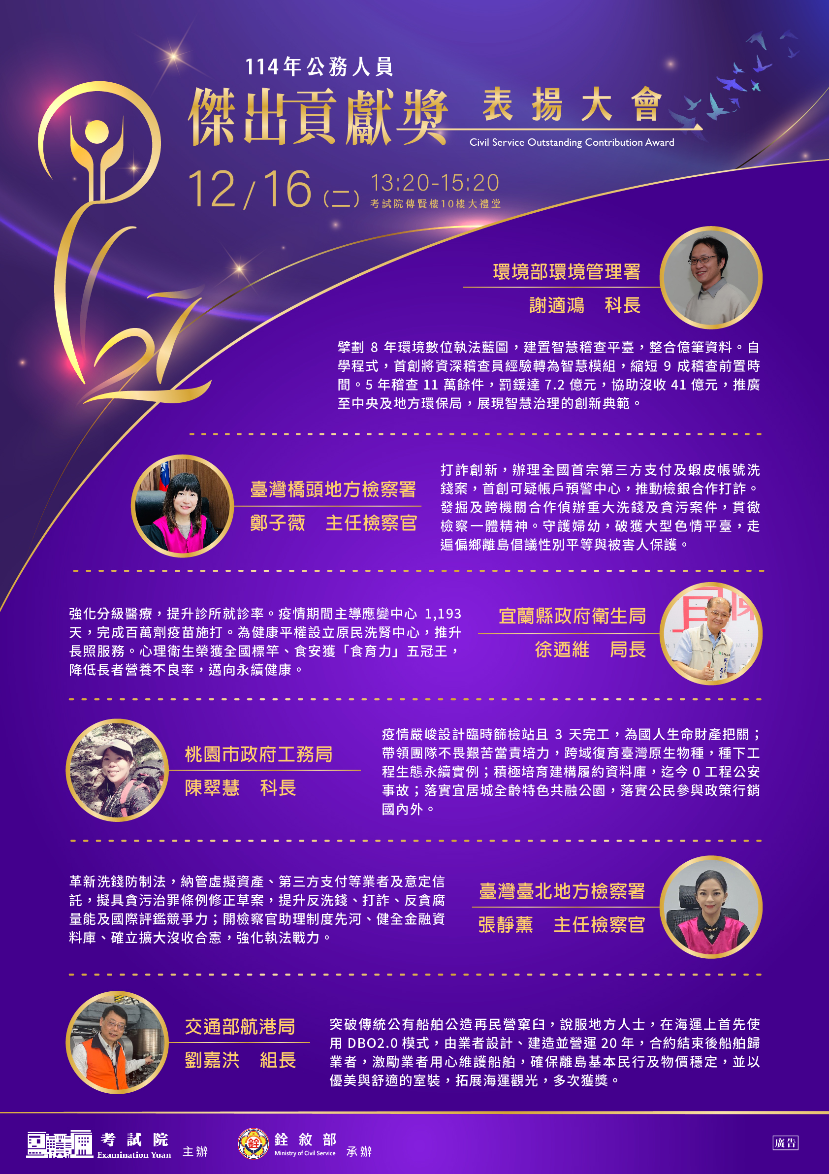 訊息公告 公告主旨 有關銓敘部函請本處協助公告「114年公務人員傑出貢獻 獎表揚大會」電子海報一案 發佈日期 2025 年 12 月 01 日 發佈單位 人事室 公告類別 處室最新消息 公告等級 轉知 點閱次數 16 公告內容 詳如附件 相關附件 114年公務人員傑出貢獻電子海報 114年公務人員傑出貢獻電子海報 檔案名稱檔案大小檔案格式下載114年公務人員傑出貢獻電子海報.jpg2.21 MB新視窗開啟檔案114年公務人員傑出貢獻電子海報1.jpg2.41 MB新視窗開啟檔案 114年公務人員傑出貢獻電子海報.jpg114年公務人員傑出貢獻電子海報1.jpg 【2025-12-01】檢送勞動部勞動力發展署桃竹苗分署「第56屆全國技能競賽北區分區 ... 【2025-12-01】國立高雄師範大學115學年度學士原住民專班招生資訊