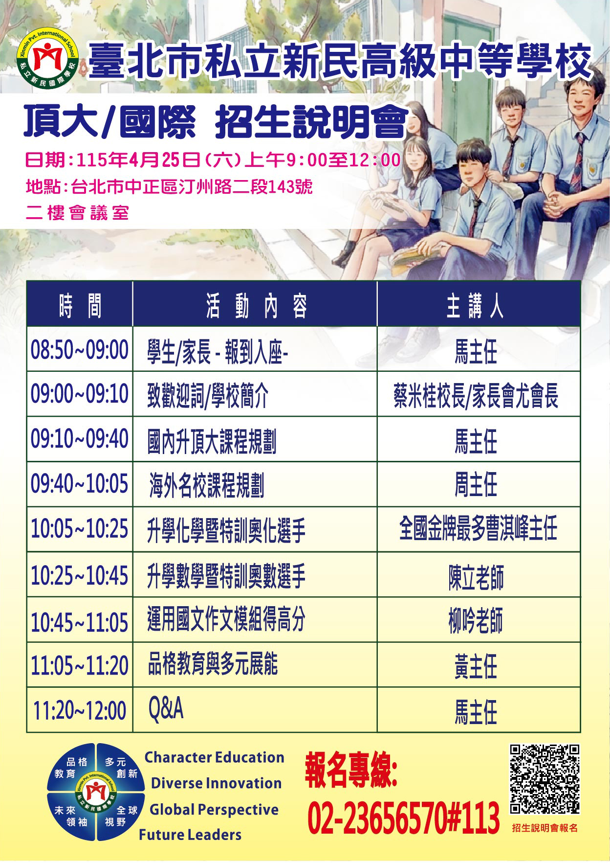 | 公告主旨 | 檢送新民高中「115年學年度高中部學校簡介暨課程說明會」 流程,請查照。 |