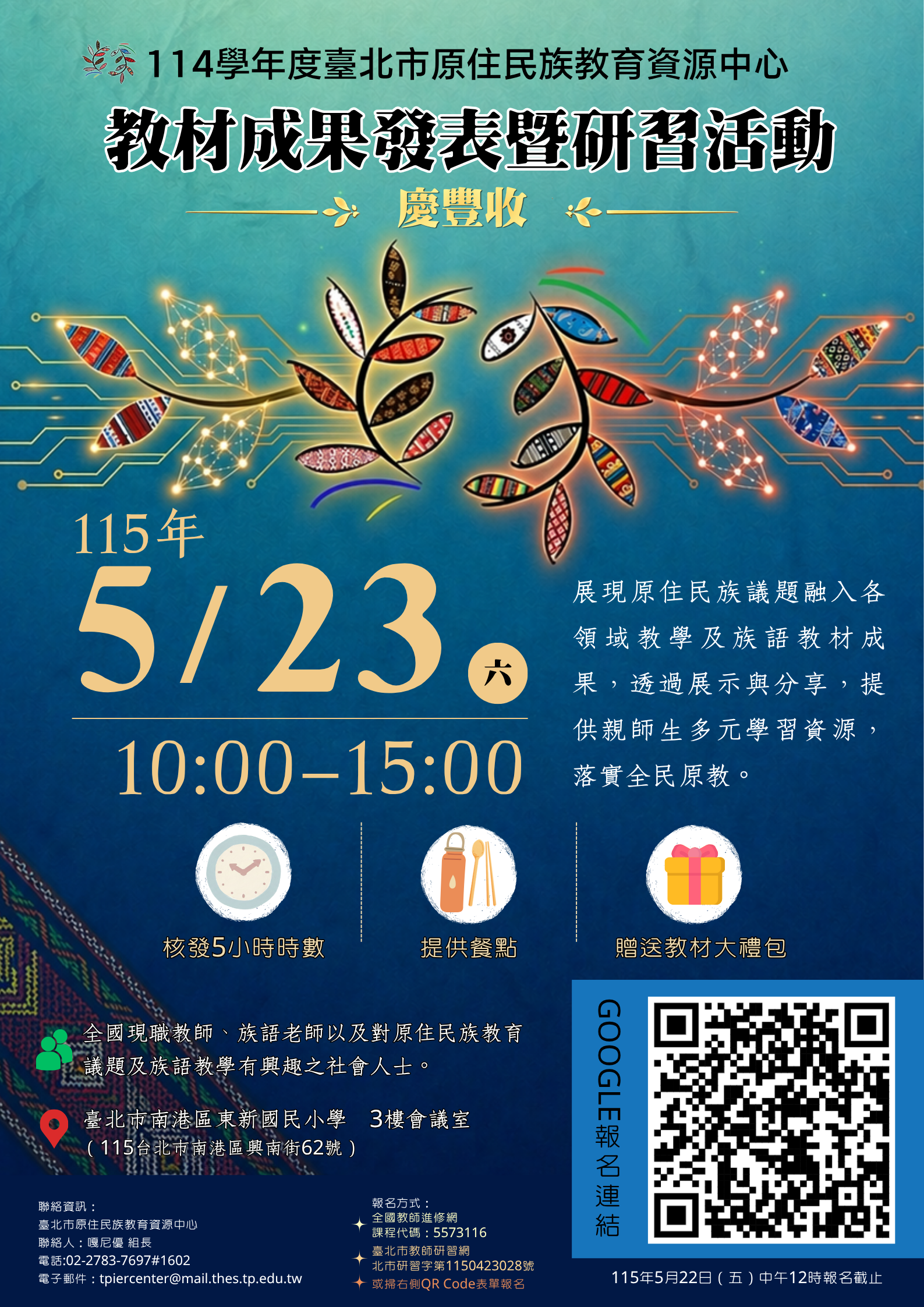 訊息公告 公告主旨 臺北市原住民族教育資源中心辦理「教材成果分享會暨推廣研習」實施計畫 發佈日期 2026 年 4 月 28 日 發佈單位 實研組 公告類別 教師研習資訊 公告等級 無 點閱次數 8 公告內容 相關附件 臺北市原住民族教育資源中心辦理「教材成果分享會暨推廣研習」實施計畫 臺北市原住民族教育資源中心辦理「教材成果分享會暨推廣研習」實施計畫 檔案名稱檔案大小檔案格式下載臺北市原住民族教育資源中心辦理「教材成果分享會暨推廣研習」實施計畫.pdf162.42 KB新視窗開啟檔案 臺北市原住民族教育資源中心辦理「教材成果分享會暨推廣研習」實施計畫.pdf 【2026-04-28】中崙高中辦理「AI融入自主學習教學」線上研習 【2026-04-28】115年環境教育議題數位教材教學設計工作坊