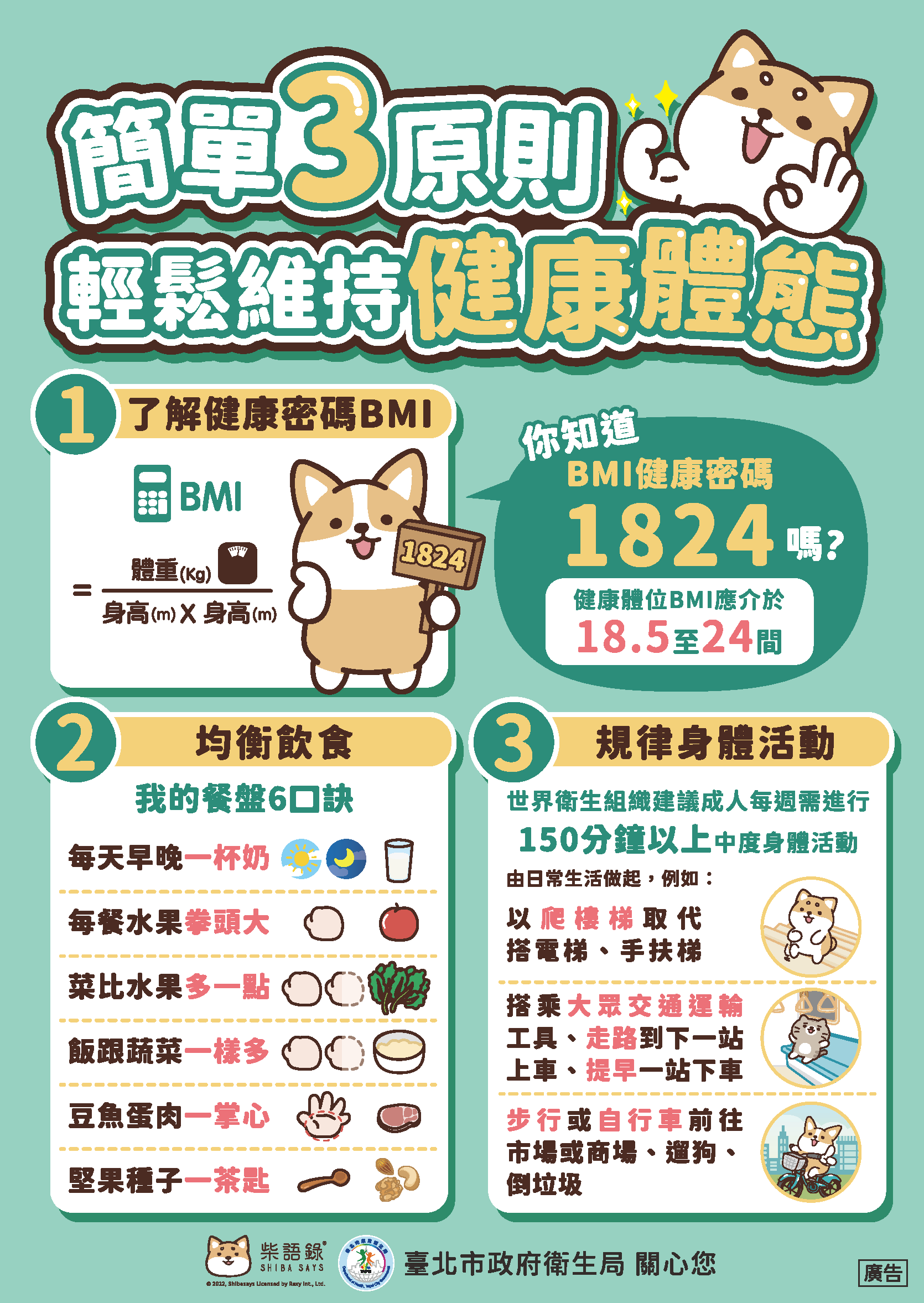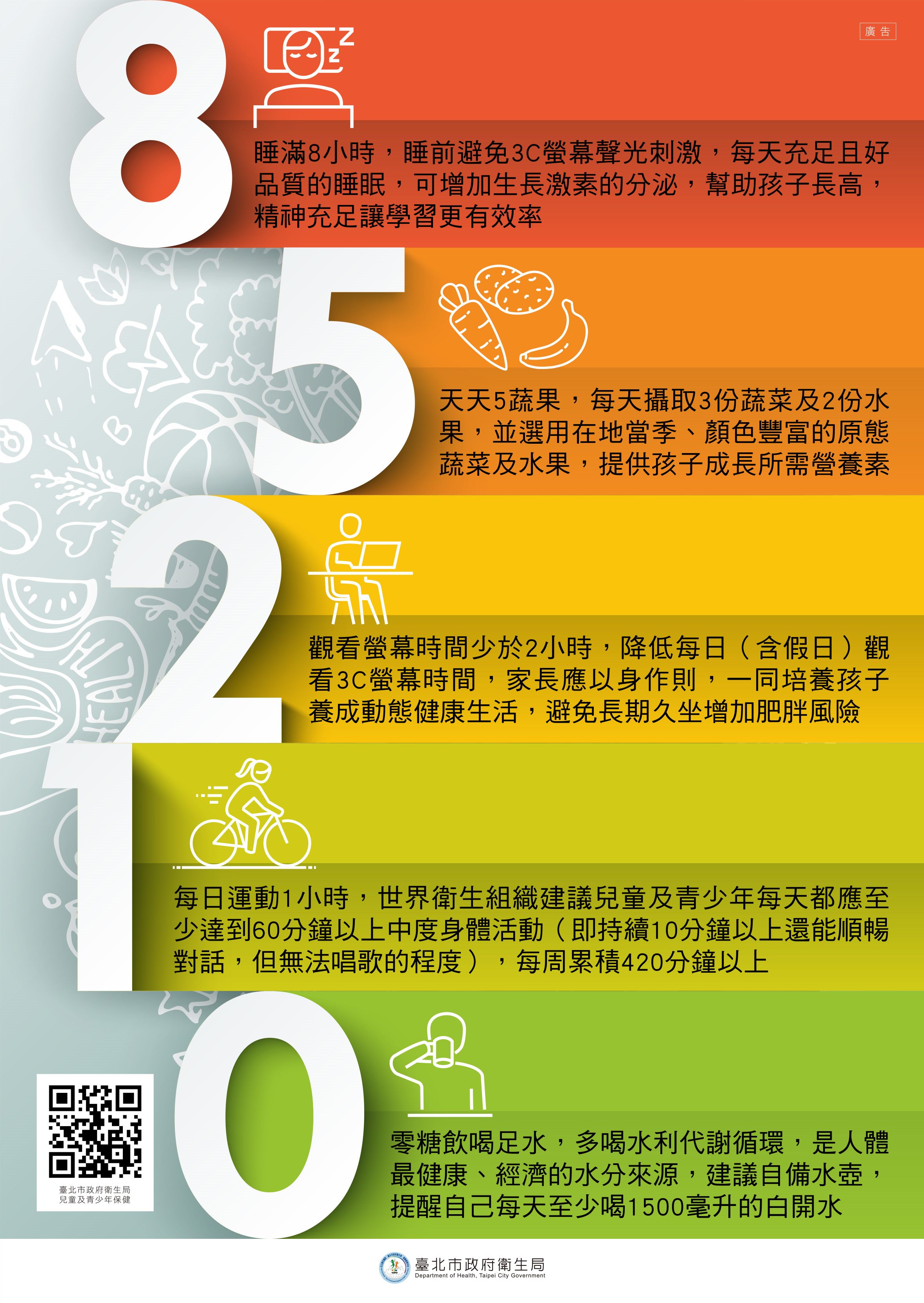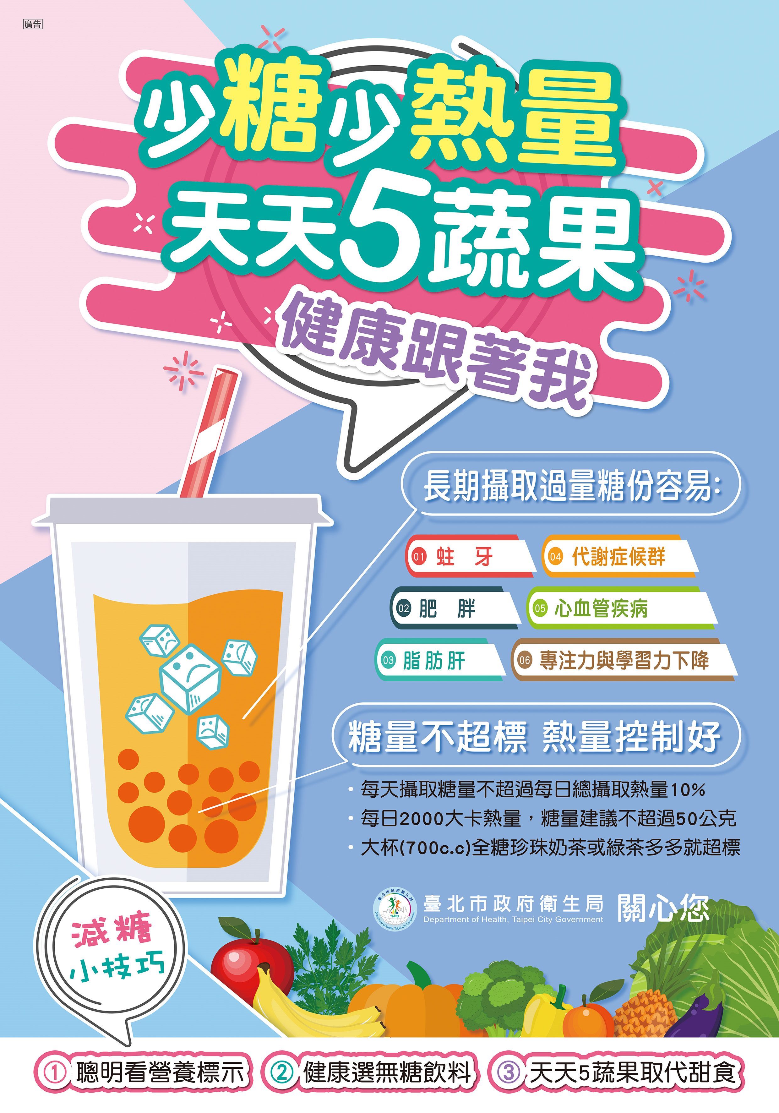 訊息公告 公告主旨 臺北市政府衛生局慢性病防治、身體活動及健康飲食宣導 發佈日期 2026 年 4 月 28 日 發佈單位 衛生組 公告類別 處室最新消息 公告等級 轉知 點閱次數 11 公告內容 相關附件 上班族(預防代謝症候群) 上班族(預防代謝症候群) 檔案名稱檔案大小檔案格式下載上班族(預防代謝症候群).pdf9.45 MB新視窗開啟檔案 上班族(預防代謝症候群).pdf 代謝症候群三折頁 代謝症候群三折頁 檔案名稱檔案大小檔案格式下載代謝症候群三折頁.pdf4.61 MB新視窗開啟檔案 代謝症候群三折頁.pdf 代謝症候群防治計畫宣導圖卡 代謝症候群防治計畫宣導圖卡 檔案名稱檔案大小檔案格式下載代謝症候群防治計畫宣導圖卡.pdf51.68 MB新視窗開啟檔案 代謝症候群防治計畫宣導圖卡.pdf 代謝症候群計畫單張 代謝症候群計畫單張 檔案名稱檔案大小檔案格式下載代謝症候群計畫單張.pdf345.44 KB新視窗開啟檔案 代謝症候群計畫單張.pdf 正確量腰圍圖卡 正確量腰圍圖卡 檔案名稱檔案大小檔案格式下載正確量腰圍圖卡.pdf18.74 MB新視窗開啟檔案 正確量腰圍圖卡.pdf 國民健康署代謝症候群衛教影片 國民健康署代謝症候群衛教影片 檔案名稱檔案大小檔案格式下載國民健康署代謝症候群衛教影片.pdf54.06 KB新視窗開啟檔案 國民健康署代謝症候群衛教影片.pdf 海報單張-好食力養成術 海報單張-好食力養成術 檔案名稱檔案大小檔案格式下載海報單張-好食力養成術.jpg1.08 MB新視窗開啟檔案 海報單張-好食力養成術.jpg 單張海報-未精緻雜糧海報jpg 單張海報-未精緻雜糧海報jpg 檔案名稱檔案大小檔案格式下載單張海報-未精緻雜糧海報jpg.jpg1.52 MB新視窗開啟檔案 單張海報-未精緻雜糧海報jpg.jpg 單張海報-我的健康餐盤宣導文宣 單張海報-我的健康餐盤宣導文宣 檔案名稱檔案大小檔案格式下載單張海報-我的健康餐盤宣導文宣.jpg287.29 KB新視窗開啟檔案 單張海報-我的健康餐盤宣導文宣.jpg 單張海報-減糖五蔬果宣導文宣 單張海報-減糖五蔬果宣導文宣 檔案名稱檔案大小檔案格式下載單張海報-減糖五蔬果宣導文宣.jpg938.61 KB新視窗開啟檔案 單張海報-減糖五蔬果宣導文宣.jpg 宣導摺頁-運動睡飽吃得巧健康體位剛剛好 宣導摺頁-運動睡飽吃得巧健康體位剛剛好 檔案名稱檔案大小檔案格式下載宣導摺頁-運動睡飽吃得巧健康體位剛剛好.pdf5.18 MB新視窗開啟檔案 宣導摺頁-運動睡飽吃得巧健康體位剛剛好.pdf 單張海報-85210宣導文宣 單張海報-85210宣導文宣 檔案名稱檔案大小檔案格式下載單張海報-85210宣導文宣.jpg762.91 KB新視窗開啟檔案 單張海報-85210宣導文宣.jpg 單張海報-柴語錄_身體活動 單張海報-柴語錄_身體活動 檔案名稱檔案大小檔案格式下載單張海報-柴語錄_身體活動 .png175.74 KB新視窗開啟檔案 單張海報-柴語錄_身體活動 .png 單張海報-柴語錄_健康體位Fo 單張海報-柴語錄_健康體位Fo 檔案名稱檔案大小檔案格式下載單張海報-柴語錄_健康體位Fo.png155.68 KB新視窗開啟檔案 單張海報-柴語錄_健康體位Fo.png 單張海報-健康體位(SAFE)宣導文宣 單張海報-健康體位(SAFE)宣導文宣 檔案名稱檔案大小檔案格式下載單張海報-健康體位(SAFE)宣導文宣.jpg509.47 KB新視窗開啟檔案 單張海報-健康體位(SAFE)宣導文宣.jpg 單張海報-健康體位宣導文宣 單張海報-健康體位宣導文宣 檔案名稱檔案大小檔案格式下載單張海報-健康體位宣導文宣.jpg753.15 KB新視窗開啟檔案 單張海報-健康體位宣導文宣.jpg 【2026-04-28】足球無人機操作增能工作坊 【2026-04-28】中崙高中辦理「AI融入自主學習教學」線上研習
