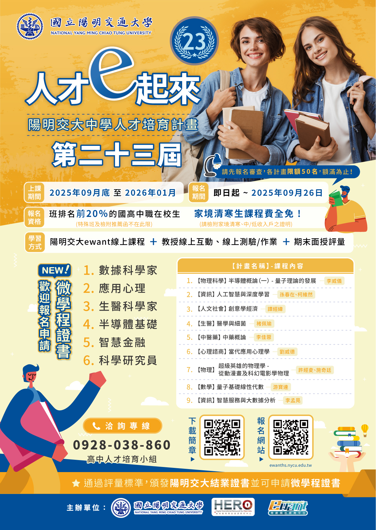 | 公告內容 | 第二十三期開課計畫包含(一) 物理科學人才培育計畫、(二) 資訊人才培育計畫、(三) 人文社會人才培育計畫、(四) 生醫人才培育計畫、(五) 中醫藥人才培育計畫、(六) 心理諮商人才培育計畫、(七) 應用物理人才培育計畫、(八) 數學人才培育計畫。詳細計畫內容可參閱計畫簡章。 學習方式:陽交大ewant育網開放教育平台線上課程、教授線上互動、線上作業測驗與期末面授評量,結業並通過各計畫評量標準,將頒發結業證書。 開課日期:114年09月29日至115年01月02日。 報名時間:即日起至114年9月26日。 詳細資訊請參閱附件或至陽明交大高等教育開放資源研究中心網站查詢。 本校不申請團報,學生可自行招集團報。 |