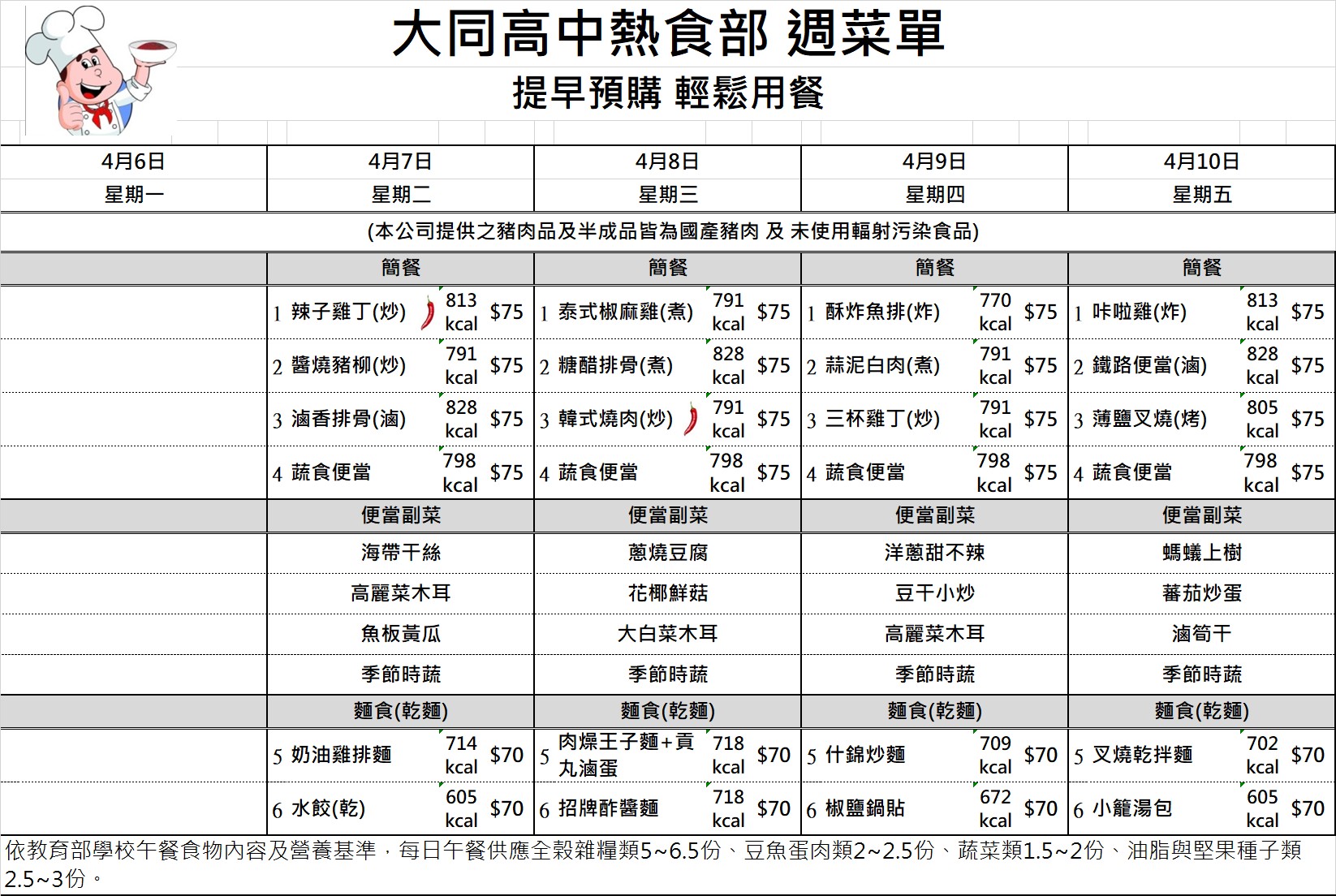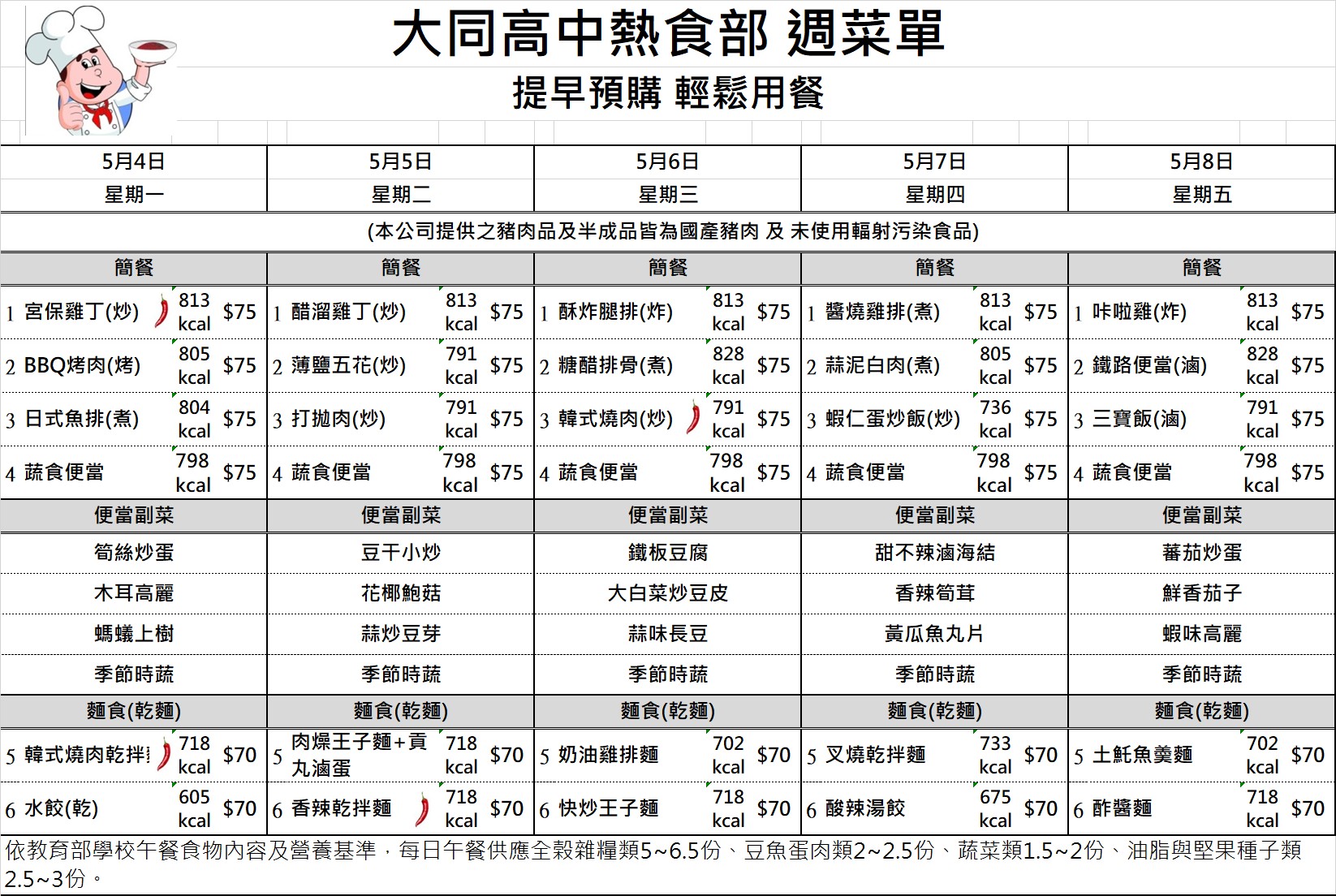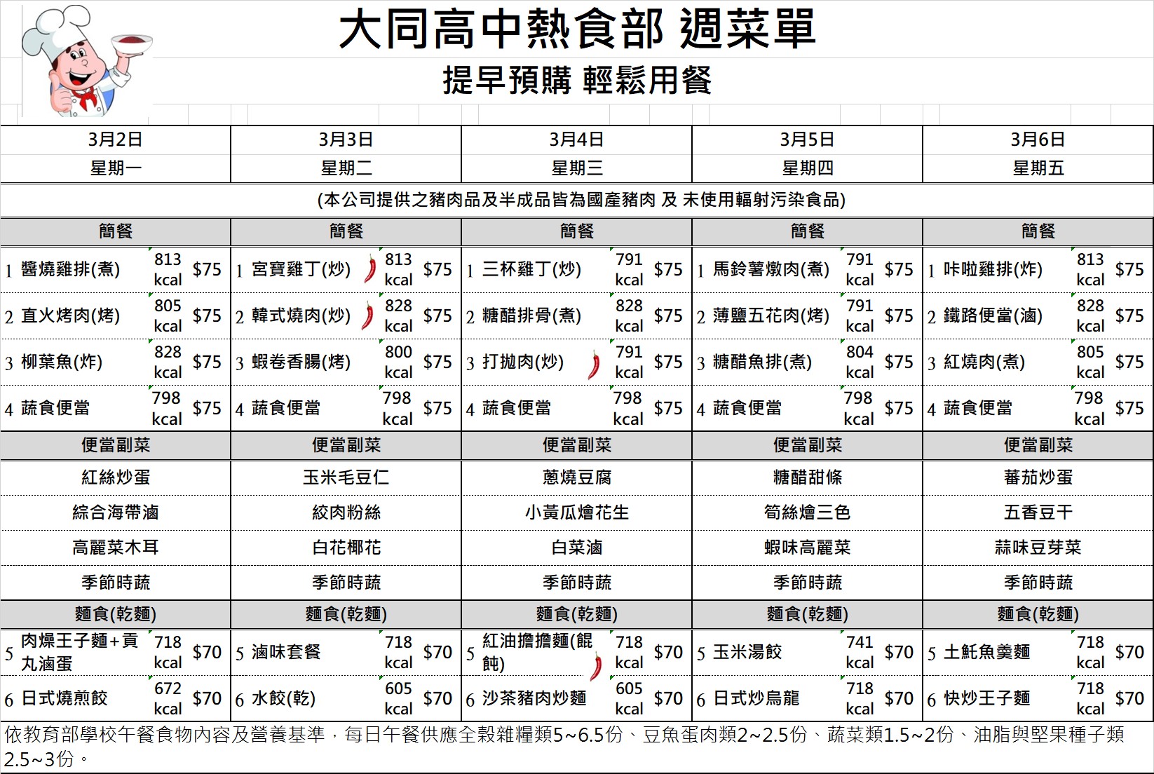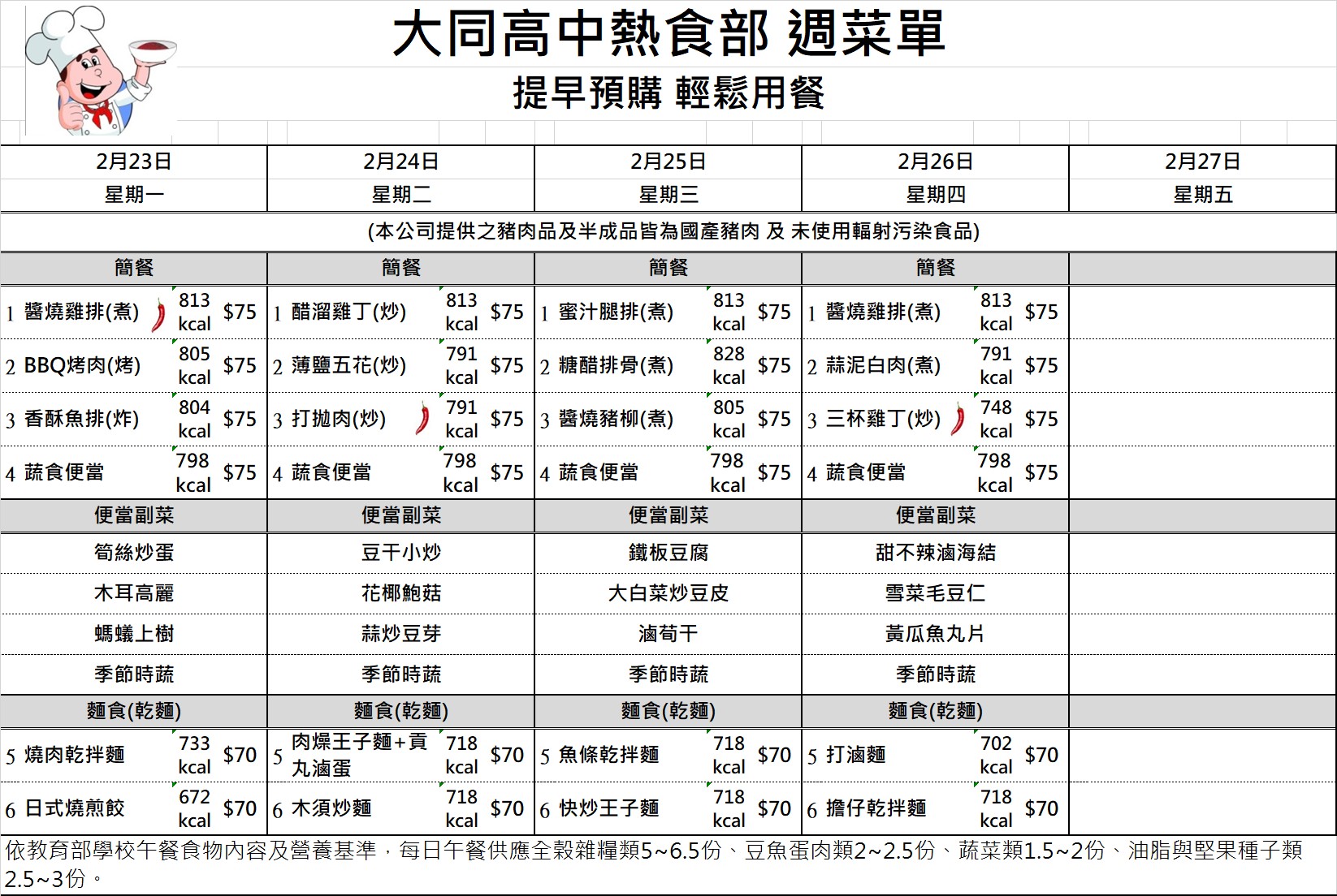 校園食品安全專區 國中部午餐金額查詢 國七115年4月訂餐總金額 國七115年4月訂餐總金額 檔案名稱檔案大小檔案格式下載國七115年4月訂餐總金額.pdf89.48 KB新視窗開啟檔案 國七115年4月訂餐總金額.pdf 國八115年4月訂餐總金額 國八115年4月訂餐總金額 檔案名稱檔案大小檔案格式下載國八115年4月訂餐總金額.pdf78.63 KB新視窗開啟檔案 國八115年4月訂餐總金額.pdf 國九115年4月訂餐總金額 國九115年4月訂餐總金額 檔案名稱檔案大小檔案格式下載國九115年4月訂餐總金額.pdf55.82 KB新視窗開啟檔案 國九115年4月訂餐總金額.pdf 午餐菜單及熱量參考 1150223-0226菜單 1150223-0226菜單 檔案名稱檔案大小檔案格式下載1150223-0226菜單.jpg471.14 KB新視窗開啟檔案 1150223-0226菜單.jpg 1150302-0306菜單 1150302-0306菜單 檔案名稱檔案大小檔案格式下載1150302-0306菜單.jpg523.00 KB新視窗開啟檔案 1150302-0306菜單.jpg 1150309-0313菜單 1150309-0313菜單 檔案名稱檔案大小檔案格式下載1150309-0313菜單.jpg521.25 KB新視窗開啟檔案 1150309-0313菜單.jpg 1150316-0320菜單 1150316-0320菜單 檔案名稱檔案大小檔案格式下載1150316-0320菜單.jpg519.26 KB新視窗開啟檔案 1150316-0320菜單.jpg 1150316-0320菜單 1150316-0320菜單 檔案名稱檔案大小檔案格式下載1150316-0320菜單.jpg519.26 KB新視窗開啟檔案 1150316-0320菜單.jpg 1150323-0327菜單 1150323-0327菜單 檔案名稱檔案大小檔案格式下載1150323-0327菜單.jpg520.95 KB新視窗開啟檔案 1150323-0327菜單.jpg 1150330-0402菜單 1150330-0402菜單 檔案名稱檔案大小檔案格式下載1150330-0402菜單.jpg468.42 KB新視窗開啟檔案 1150330-0402菜單.jpg 1150407-0410菜單 1150407-0410菜單 檔案名稱檔案大小檔案格式下載1150407-0410菜單.jpg467.31 KB新視窗開啟檔案 1150407-0410菜單.jpg 1150413-0417菜單 1150413-0417菜單 檔案名稱檔案大小檔案格式下載1150413-0417菜單.jpg520.23 KB新視窗開啟檔案 1150413-0417菜單.jpg 1150420-0424菜單 1150420-0424菜單 檔案名稱檔案大小檔案格式下載1150420-0424菜單.jpg520.04 KB新視窗開啟檔案 1150420-0424菜單.jpg 1150427-0430菜單 1150427-0430菜單 檔案名稱檔案大小檔案格式下載1150427-0430菜單.jpg469.86 KB新視窗開啟檔案 1150427-0430菜單.jpg 1150504-0508菜單 1150504-0508菜單 檔案名稱檔案大小檔案格式下載1150504-0508菜單.jpg519.81 KB新視窗開啟檔案 1150504-0508菜單.jpg 1150511-0515菜單 1150511-0515菜單 檔案名稱檔案大小檔案格式下載1150511-0515菜單 .jpg468.48 KB新視窗開啟檔案 1150511-0515菜單 .jpg 1150518-0522菜單 1150518-0522菜單 檔案名稱檔案大小檔案格式下載1150518-0522菜單.jpg521.46 KB新視窗開啟檔案 1150518-0522菜單.jpg 1150525-0529菜單 1150525-0529菜單 檔案名稱檔案大小檔案格式下載1150525-0529菜單.jpg520.42 KB新視窗開啟檔案 1150525-0529菜單.jpg 午供會議紀錄 111學年度第一學期午供會議記錄 111學年度第一學期午供會議記錄 檔案名稱檔案大小檔案格式下載111學年度第一學期午供會議記錄.pdf395.69 KB新視窗開啟檔案 111學年度第一學期午供會議記錄.pdf 111學年度第二學期午供會議記錄 111學年度第二學期午供會議記錄 檔案名稱檔案大小檔案格式下載111學年度第二學期午供會議記錄.pdf80.30 KB新視窗開啟檔案 111學年度第二學期午供會議記錄.pdf 111學年度第二學期第二次午供會會議記錄 111學年度第二學期第二次午供會會議記錄 檔案名稱檔案大小檔案格式下載111學年度第二學期第二次午供會會議記錄.pdf113.53 KB新視窗開啟檔案 111學年度第二學期第二次午供會會議記錄.pdf 112學年度第一學期午供會議記錄 112學年度第一學期午供會議記錄 檔案名稱檔案大小檔案格式下載1120914午餐供應委員會議紀錄.pdf427.25 KB新視窗開啟檔案 1120914午餐供應委員會議紀錄.pdf 112學年度第二學期午供會議紀錄 112學年度第二學期午供會議紀錄 檔案名稱檔案大小檔案格式下載1130306午餐供應委員會議紀錄_更新.pdf151.71 KB新視窗開啟檔案 1130306午餐供應委員會議紀錄_更新.pdf 113學年度第一學期午供會議紀錄 113學年度第一學期午供會議紀錄 檔案名稱檔案大小檔案格式下載113學年度第一學期午供會議紀錄.pdf92.52 KB新視窗開啟檔案 113學年度第一學期午供會議紀錄.pdf 113學年度第二學期期初午供會議記錄 113學年度第二學期期初午供會議記錄 檔案名稱檔案大小檔案格式下載113學年度第二學期期初午供會議記錄.pdf79.53 KB新視窗開啟檔案 113學年度第二學期期初午供會議記錄.pdf 113學年度第二學期期末午供會議記錄 113學年度第二學期期末午供會議記錄 檔案名稱檔案大小檔案格式下載113學年度第二學期期末午供會議記錄.pdf66.20 KB新視窗開啟檔案 113學年度第二學期期末午供會議記錄.pdf 114學年度第一學期期初午供會議紀錄 114學年度第一學期期初午供會議紀錄 檔案名稱檔案大小檔案格式下載1140910午餐供應委員會議紀錄.pdf105.56 KB新視窗開啟檔案 1140910午餐供應委員會議紀錄.pdf 114學年度第一學期期末午供會議記錄 114學年度第一學期期末午供會議記錄 檔案名稱檔案大小檔案格式下載114學年度第一學期期末午供會議記錄.pdf104.61 KB新視窗開啟檔案 114學年度第一學期期末午供會議記錄.pdf 臺北市立大同高級中學午餐供應委員會設置要點 禁用非環保餐具 臺北市食材登錄平台 食安資訊 臺北市食材登錄平台 臺北市立大同高級中學高中部學生外食訂購實施要點 臺北市立大同高級中學高中部學生外食訂購實施要點 檔案名