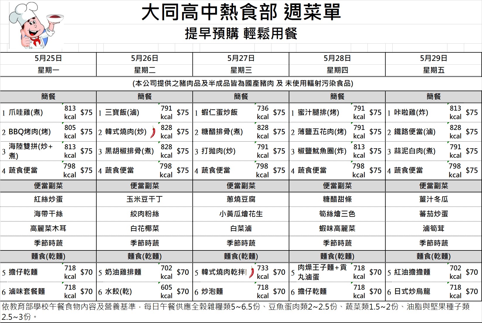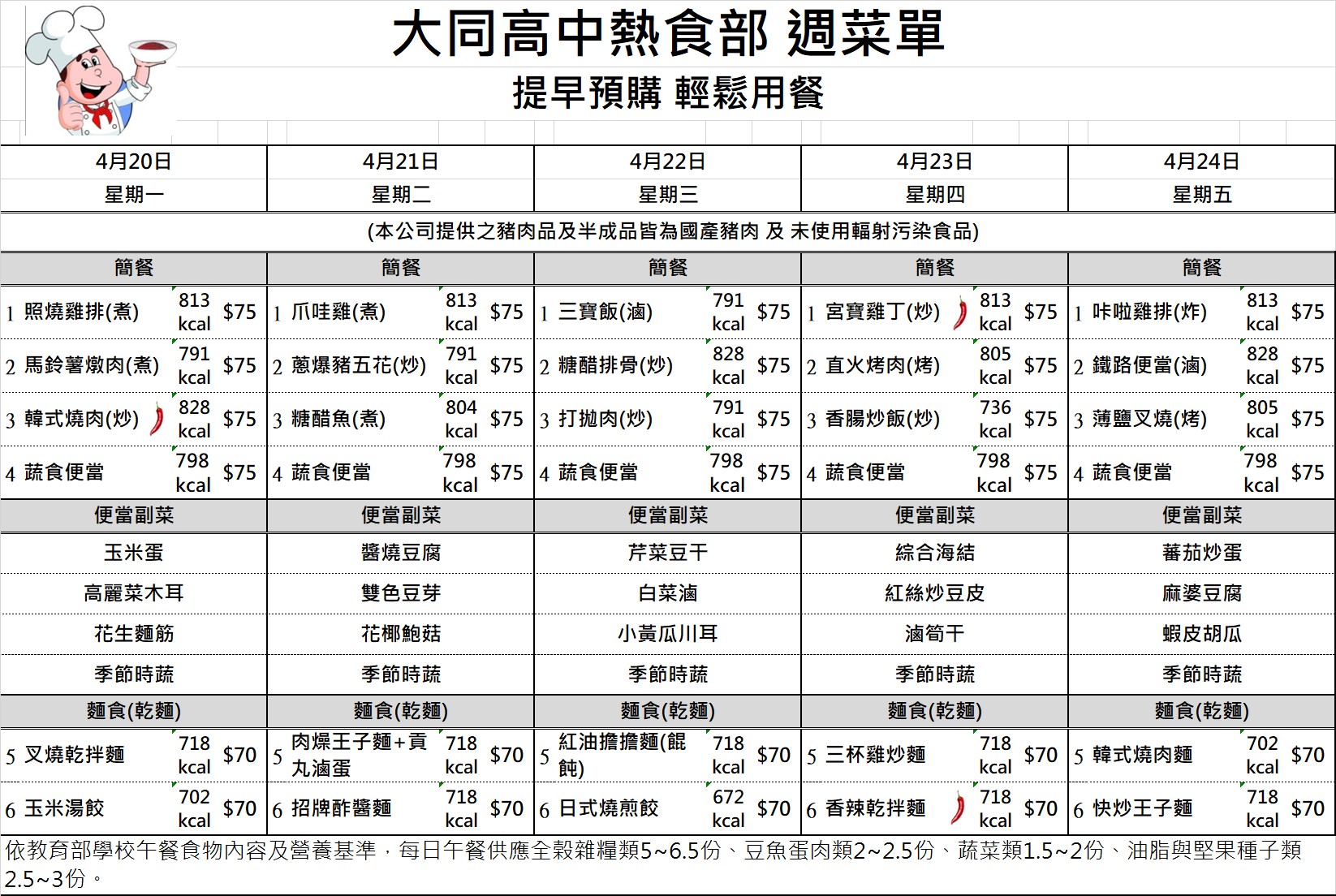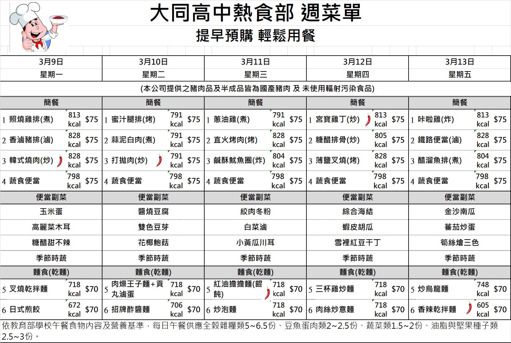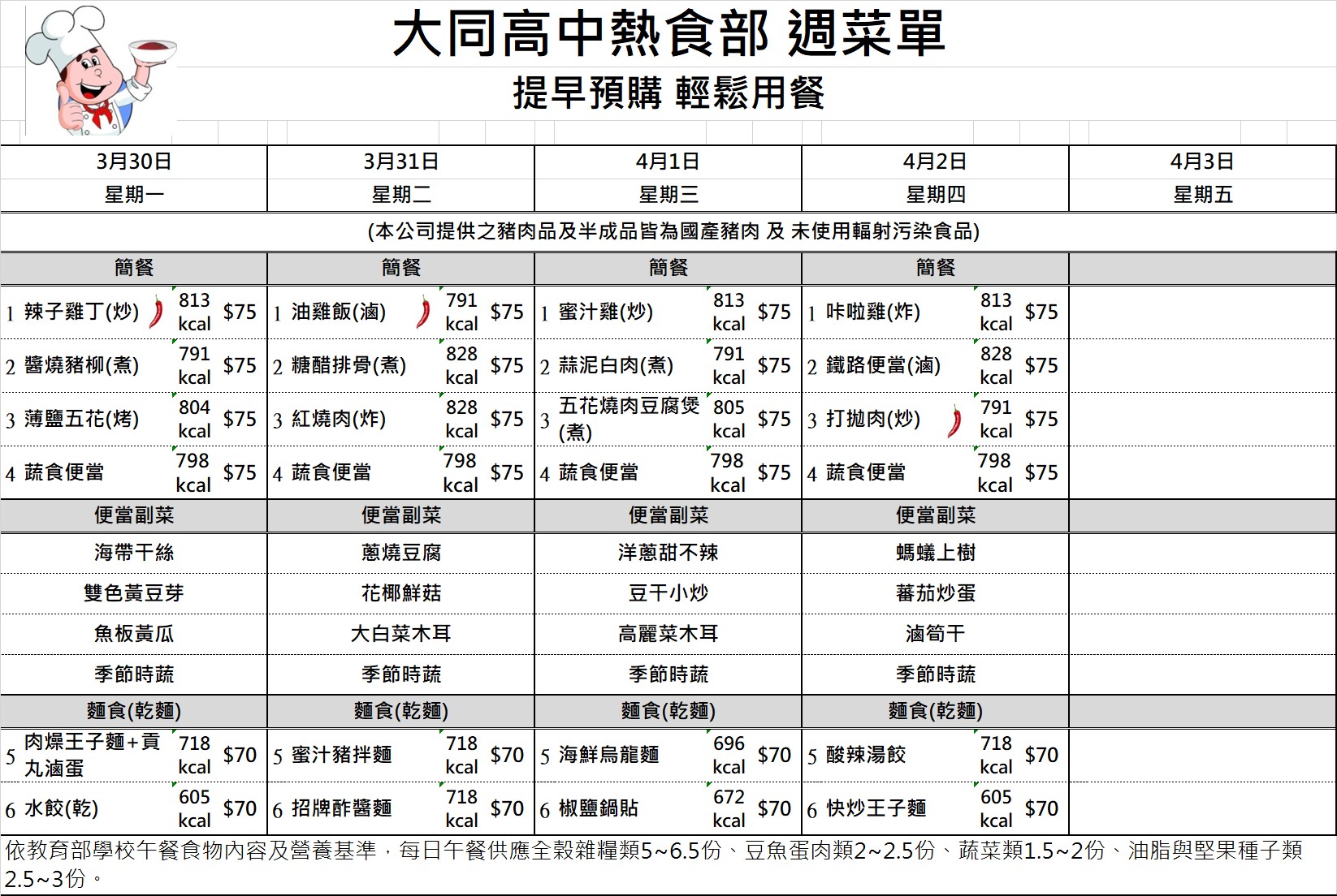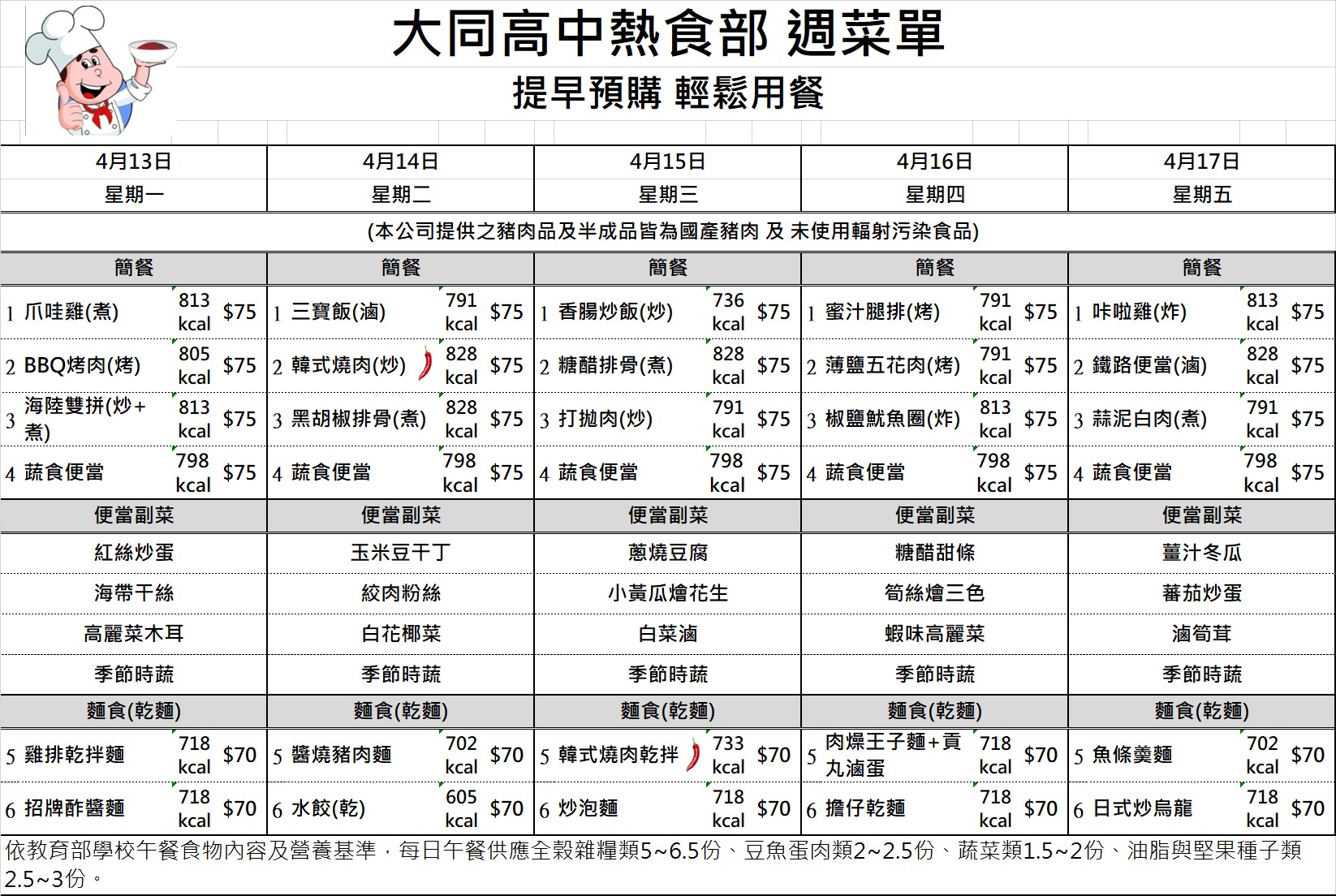 校園食品安全專區 國中部午餐金額查詢 國七115年4月訂餐總金額 國七115年4月訂餐總金額 檔案名稱檔案大小檔案格式下載國七115年4月訂餐總金額.pdf89.48 KB新視窗開啟檔案 國七115年4月訂餐總金額.pdf 國八115年4月訂餐總金額 國八115年4月訂餐總金額 檔案名稱檔案大小檔案格式下載國八115年4月訂餐總金額.pdf78.63 KB新視窗開啟檔案 國八115年4月訂餐總金額.pdf 國九115年4月訂餐總金額 國九115年4月訂餐總金額 檔案名稱檔案大小檔案格式下載國九115年4月訂餐總金額.pdf55.82 KB新視窗開啟檔案 國九115年4月訂餐總金額.pdf 午餐菜單及熱量參考 1150223-0226菜單 1150223-0226菜單 檔案名稱檔案大小檔案格式下載1150223-0226菜單.jpg471.14 KB新視窗開啟檔案 1150223-0226菜單.jpg 1150302-0306菜單 1150302-0306菜單 檔案名稱檔案大小檔案格式下載1150302-0306菜單.jpg523.00 KB新視窗開啟檔案 1150302-0306菜單.jpg 1150309-0313菜單 1150309-0313菜單 檔案名稱檔案大小檔案格式下載1150309-0313菜單.jpg521.25 KB新視窗開啟檔案 1150309-0313菜單.jpg 1150316-0320菜單 1150316-0320菜單 檔案名稱檔案大小檔案格式下載1150316-0320菜單.jpg519.26 KB新視窗開啟檔案 1150316-0320菜單.jpg 1150316-0320菜單 1150316-0320菜單 檔案名稱檔案大小檔案格式下載1150316-0320菜單.jpg519.26 KB新視窗開啟檔案 1150316-0320菜單.jpg 1150323-0327菜單 1150323-0327菜單 檔案名稱檔案大小檔案格式下載1150323-0327菜單.jpg520.95 KB新視窗開啟檔案 1150323-0327菜單.jpg 1150330-0402菜單 1150330-0402菜單 檔案名稱檔案大小檔案格式下載1150330-0402菜單.jpg468.42 KB新視窗開啟檔案 1150330-0402菜單.jpg 1150407-0410菜單 1150407-0410菜單 檔案名稱檔案大小檔案格式下載1150407-0410菜單.jpg467.31 KB新視窗開啟檔案 1150407-0410菜單.jpg 1150413-0417菜單 1150413-0417菜單 檔案名稱檔案大小檔案格式下載1150413-0417菜單.jpg520.23 KB新視窗開啟檔案 1150413-0417菜單.jpg 1150420-0424菜單 1150420-0424菜單 檔案名稱檔案大小檔案格式下載1150420-0424菜單.jpg520.04 KB新視窗開啟檔案 1150420-0424菜單.jpg 1150427-0430菜單 1150427-0430菜單 檔案名稱檔案大小檔案格式下載1150427-0430菜單.jpg469.86 KB新視窗開啟檔案 1150427-0430菜單.jpg 1150504-0508菜單 1150504-0508菜單 檔案名稱檔案大小檔案格式下載1150504-0508菜單.jpg519.81 KB新視窗開啟檔案 1150504-0508菜單.jpg 1150511-0515菜單 1150511-0515菜單 檔案名稱檔案大小檔案格式下載1150511-0515菜單 .jpg468.48 KB新視窗開啟檔案 1150511-0515菜單 .jpg 1150518-0522菜單 1150518-0522菜單 檔案名稱檔案大小檔案格式下載1150518-0522菜單.jpg521.46 KB新視窗開啟檔案 1150518-0522菜單.jpg 1150525-0529菜單 1150525-0529菜單 檔案名稱檔案大小檔案格式下載1150525-0529菜單.jpg520.42 KB新視窗開啟檔案 1150525-0529菜單.jpg 午供會議紀錄 111學年度第一學期午供會議記錄 111學年度第一學期午供會議記錄 檔案名稱檔案大小檔案格式下載111學年度第一學期午供會議記錄.pdf395.69 KB新視窗開啟檔案 111學年度第一學期午供會議記錄.pdf 111學年度第二學期午供會議記錄 111學年度第二學期午供會議記錄 檔案名稱檔案大小檔案格式下載111學年度第二學期午供會議記錄.pdf80.30 KB新視窗開啟檔案 111學年度第二學期午供會議記錄.pdf 111學年度第二學期第二次午供會會議記錄 111學年度第二學期第二次午供會會議記錄 檔案名稱檔案大小檔案格式下載111學年度第二學期第二次午供會會議記錄.pdf113.53 KB新視窗開啟檔案 111學年度第二學期第二次午供會會議記錄.pdf 112學年度第一學期午供會議記錄 112學年度第一學期午供會議記錄 檔案名稱檔案大小檔案格式下載1120914午餐供應委員會議紀錄.pdf427.25 KB新視窗開啟檔案 1120914午餐供應委員會議紀錄.pdf 112學年度第二學期午供會議紀錄 112學年度第二學期午供會議紀錄 檔案名稱檔案大小檔案格式下載1130306午餐供應委員會議紀錄_更新.pdf151.71 KB新視窗開啟檔案 1130306午餐供應委員會議紀錄_更新.pdf 113學年度第一學期午供會議紀錄 113學年度第一學期午供會議紀錄 檔案名稱檔案大小檔案格式下載113學年度第一學期午供會議紀錄.pdf92.52 KB新視窗開啟檔案 113學年度第一學期午供會議紀錄.pdf 113學年度第二學期期初午供會議記錄 113學年度第二學期期初午供會議記錄 檔案名稱檔案大小檔案格式下載113學年度第二學期期初午供會議記錄.pdf79.53 KB新視窗開啟檔案 113學年度第二學期期初午供會議記錄.pdf 113學年度第二學期期末午供會議記錄 113學年度第二學期期末午供會議記錄 檔案名稱檔案大小檔案格式下載113學年度第二學期期末午供會議記錄.pdf66.20 KB新視窗開啟檔案 113學年度第二學期期末午供會議記錄.pdf 114學年度第一學期期初午供會議紀錄 114學年度第一學期期初午供會議紀錄 檔案名稱檔案大小檔案格式下載1140910午餐供應委員會議紀錄.pdf105.56 KB新視窗開啟檔案 1140910午餐供應委員會議紀錄.pdf 114學年度第一學期期末午供會議記錄 114學年度第一學期期末午供會議記錄 檔案名稱檔案大小檔案格式下載114學年度第一學期期末午供會議記錄.pdf104.61 KB新視窗開啟檔案 114學年度第一學期期末午供會議記錄.pdf 臺北市立大同高級中學午餐供應委員會設置要點 禁用非環保餐具 臺北市食材登錄平台 食安資訊 臺北市食材登錄平台 臺北市立大同高級中學高中部學生外食訂購實施要點 臺北市立大同高級中學高中部學生外食訂購實施要點 檔案名